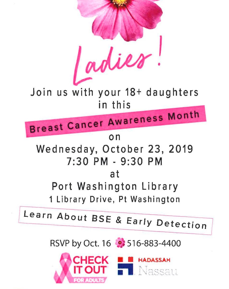 "We encourage family members and friends to unite in the fight against breast cancer not just now but all throughout the year", explained Katz.  "This event stresses the importance of good personal health through knowledge and action."  The event is for all women 18 years of age and older.  Share this information with your female contemporaries – daughters, wives, aunts, moms, sisters, friends, and co-workers.  .